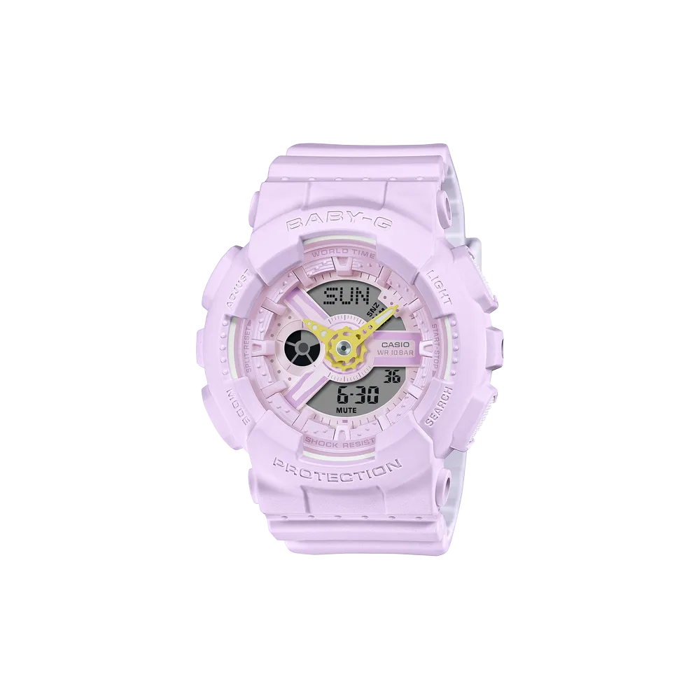 Baby-G exists because not everyone wants a 52mm black brick on their wrist. The BA-110 series takes the analog-digital combo that works so well in G-Shock and scales it down to something more wearable. The AH-6A variant adds pastel lavender to the mix—and somehow pulls it off.