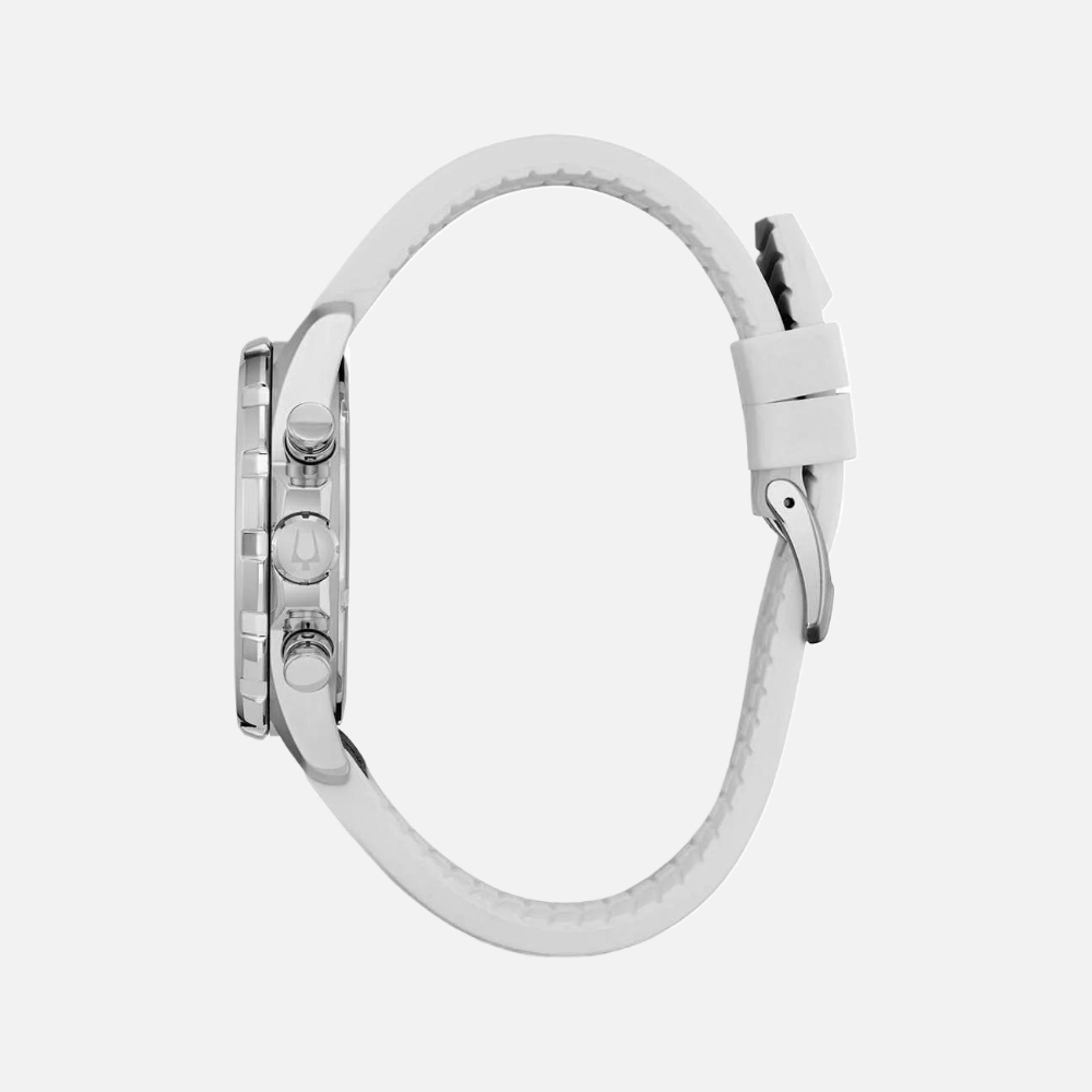 The Bulova Marine Star Chronograph Blue Dial Men’s Watch (SKU: 96B287) is a masterpiece of modern watchmaking. Crafted with a stainless steel case and adorned with a white silicone strap featuring a blue leather inlay, this watch offers an exquisite blend of style and durability. The uni-directional rotating bezel in silver-tone adds a touch of sophistication, making it not just a timepiece, but a statement.
