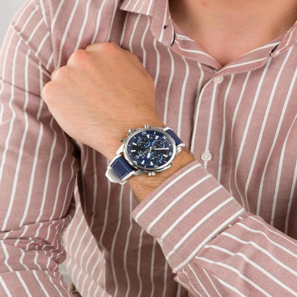 Equipped with a quartz movement, this watch is designed for accuracy and reliability. The blue dial with luminous silver-tone hands and index hour markers ensures clear visibility, even in low-light conditions. With a chronograph function, date display between the 4 and 5 o’clock positions, and water resistance up to 100 meters (330 feet), it is perfect for both casual and sporty occasions.