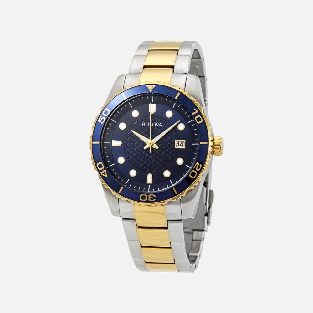 Two-tone watches walk a fine line—they can look sharp or they can look like something found at a flea market. The 98A200 lands on the right side. The gold-tone bezel and bracelet links are restrained enough to read as warm rather than flashy, and the blue dial ties it together.