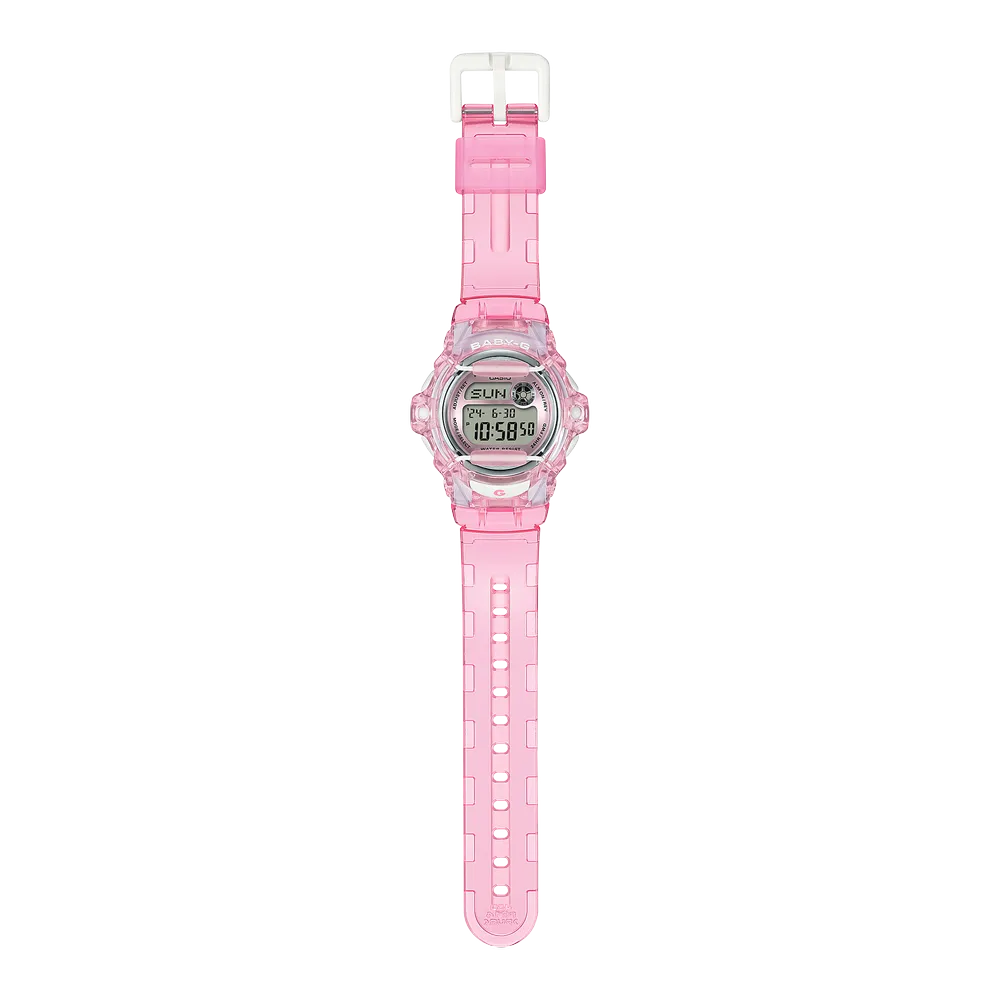 Casio’s Baby-G Whale series in transparent pink—200m water resistant, shock resistant, and 43 grams light. The BG-169R packs world time, stopwatch, countdown timer, and five alarms into a case that’s been a favorite since the late ’90s.