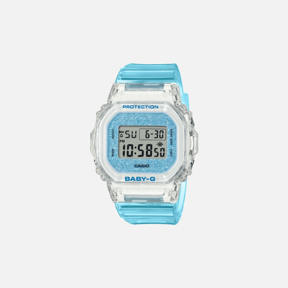 We are pleased to present the Casio BABY-G BGD-565GC-2, a reinterpretation of the classic BGD-565 digital form, reimagined with see-through resin components and a glittering blue dial. The watch retains the angular monochrome profile the BGD-565 line is known for, but gives it a playful twist: translucent resin is used for both bezel and band, letting subtle hints of color and light interplay underneath. The dial shimmers with fine glitter, lending a touch of flair without sacrificing functionality.