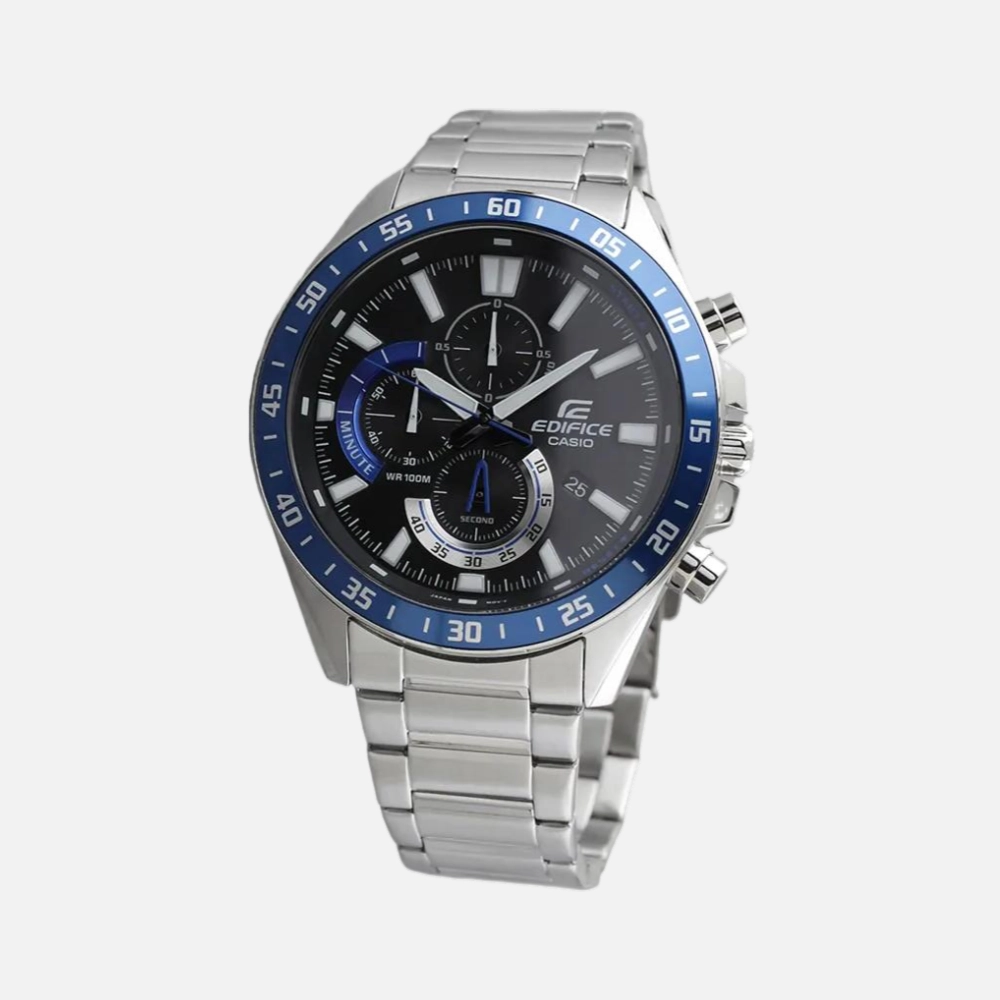 Casio’s Edifice line brings motorsport aesthetics to everyday watches. The EFV620D packs a chronograph, tachymeter bezel, and 100m water resistance into a 50mm stainless steel case. It’s busy in a way that works—technical without being unreadable.