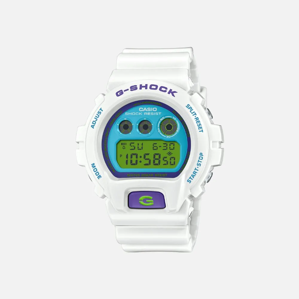 The DW6900RCS-7 is a nod to the vibrant, bold colors that defined the G-SHOCK series on its 25th anniversary in 2008. From the electric lime green dial set against a sleek black base to the vivid blue dial complemented by a pristine white base, and not to forget the stunning shocking pink that covers both the LCD and the base, each variant offers a unique visual experience. This resurrection of the crazy colors is not just a watch; it’s a statement piece that promises to stand out in any crowd.