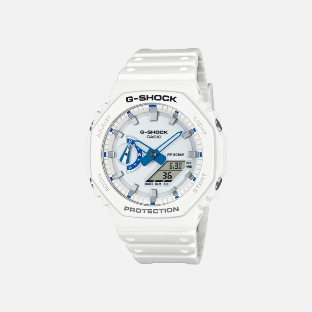 The GA-2100 earned its “CasiOak” nickname for that octagonal bezel, and this variant keeps the same 11.8mm thickness that makes the 2100 series wearable. At 51g with the carbon core guard structure, it’s light on the wrist without sacrificing shock resistance. The white and blue colorway is clean.