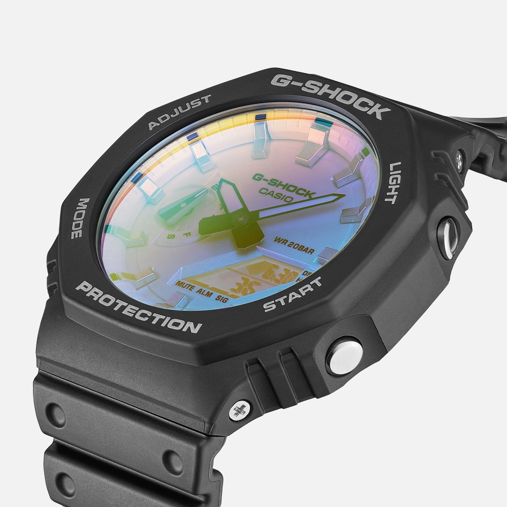 Step into a world of unparalleled elegance with the Casio G-Shock GA2100SR-1A. This timepiece is not just a watch; it’s an experience. Immerse yourself in the vibrant iridescence of the first-ever G-SHOCK featuring a full-surface gradated crystal finish, reminiscent of sunlight reflecting off a midsummer sky at dusk. Each crystal is uniquely crafted, offering a one-of-a-kind color pattern that changes with the light, ensuring your watch is as unique as you are.