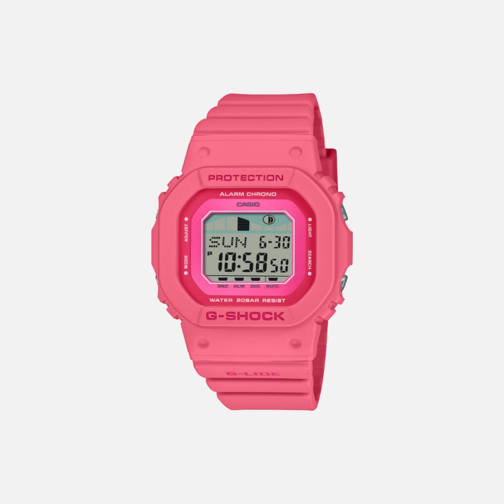 Casio’s G-Shock GLX-S5610-4 brings the brand’s surf-minded G-LIDE series into a slimmer, more compact profile perfect for those who want full functionality without unnecessary bulk. The square case design nods to the original 5600 series, yet here it’s wrapped in a vibrant pink resin that’s hard to miss on land or at sea. Built on the trusted G-Shock foundation, this model is shock resistant, water resistant to 200 meters, and engineered for the unpredictable conditions of surf and sport.