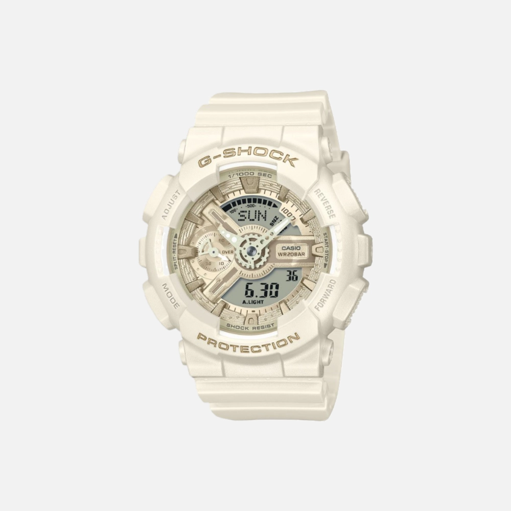 Not everyone wants a 51mm watch strapped to their wrist. The G-Shock S-Series addresses that with the same 110-series design language scaled to 45.9mm. The GMAS-110ST-7A goes further with a pearlescent white finish that Casio describes as “silk-like”—it shifts between cool white and warm cream depending on the light.