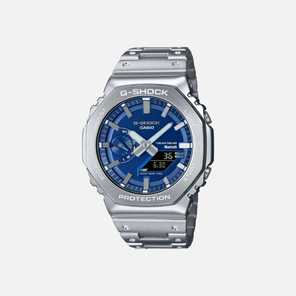 Introducing the Casio G-Shock GMB2100AD-2A, a masterpiece that combines classic elegance with modern innovation. The watch features a full-metal construction with a stunning blue dial, achieved through metallic blue vapor deposition. This vibrant hue adds a unique flair to the iconic stainless-steel bezel and band, making it a true standout piece.
