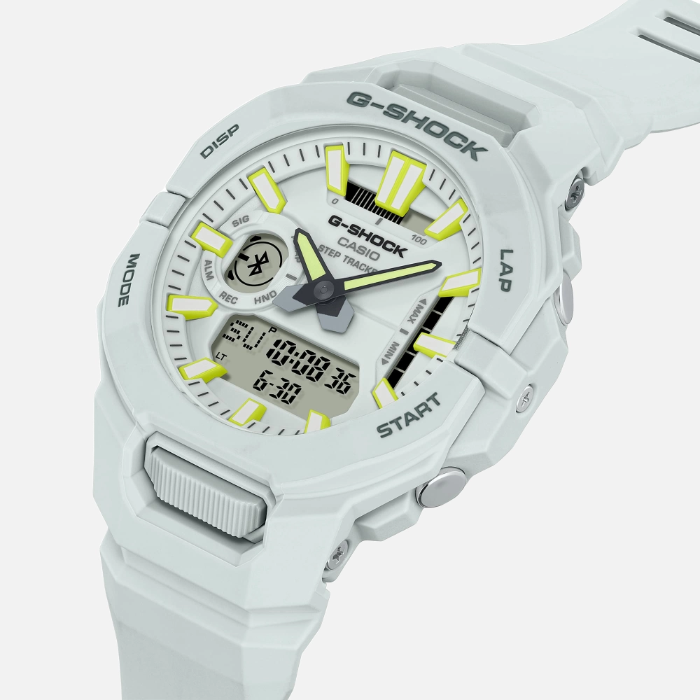 Same fitness-focused G-Shock as the black model, different aesthetic. White resin with subtle accent colors gives this a cleaner, more athletic look that works well with gym gear or casual wear.
