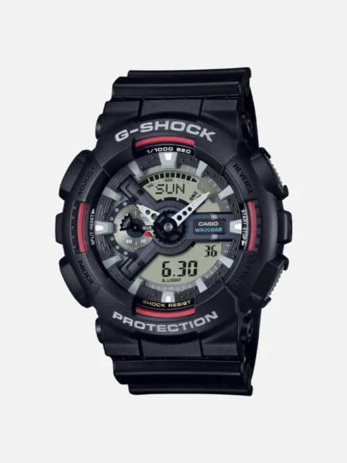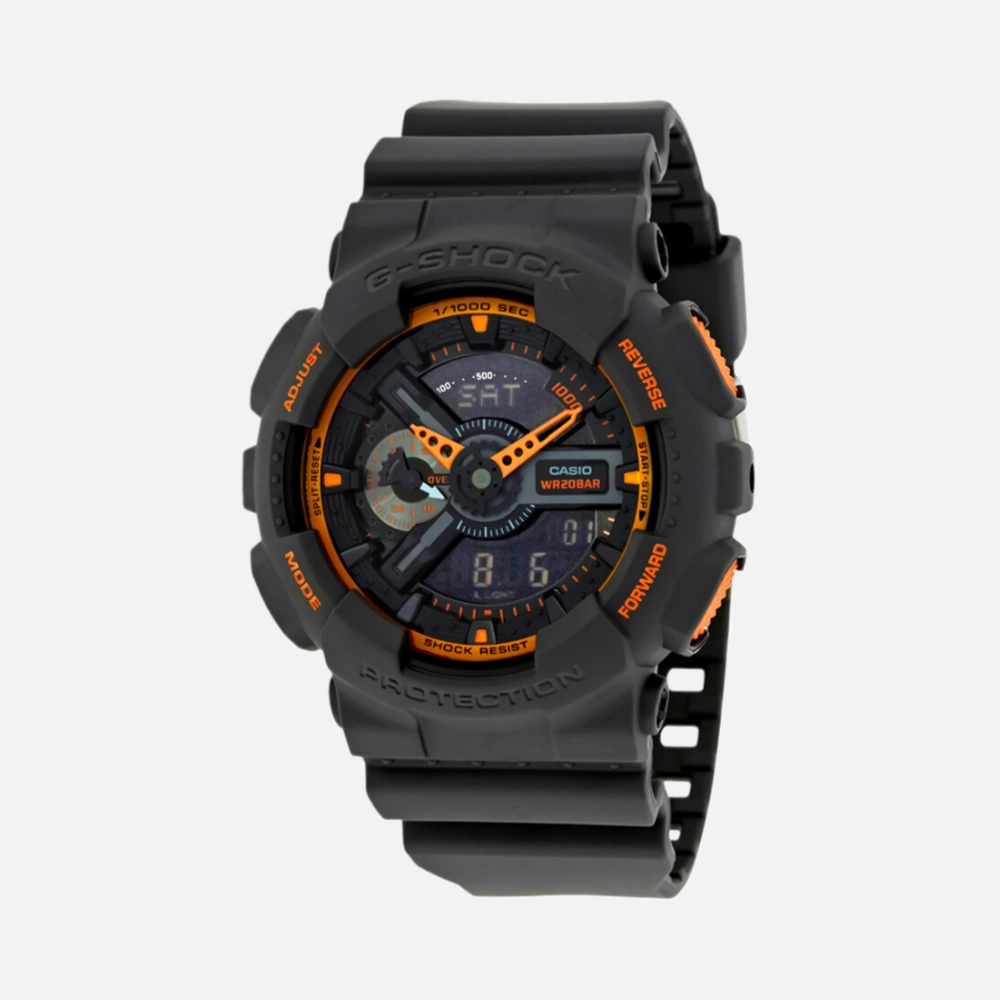 The GA-110 series runs on module 5146—analog hands over a digital display. You get the quick glance-ability of analog with digital precision when you need it. World time across 48 cities, five alarms, stopwatch, and countdown timer. The negative LCD can be harder to read in low light, but the LED backlight handles that.