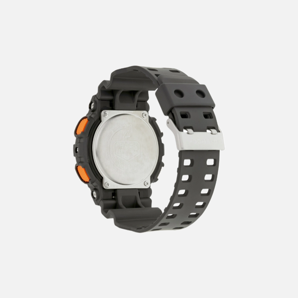 The GA-110TS-1A4 leans into the understated side of G-Shock—matte grey resin with orange accents that actually work. Module 5146 analog-digital layout, world time across 48 cities, and Alpha Gel protection throughout. The layered band looks better than it sounds.