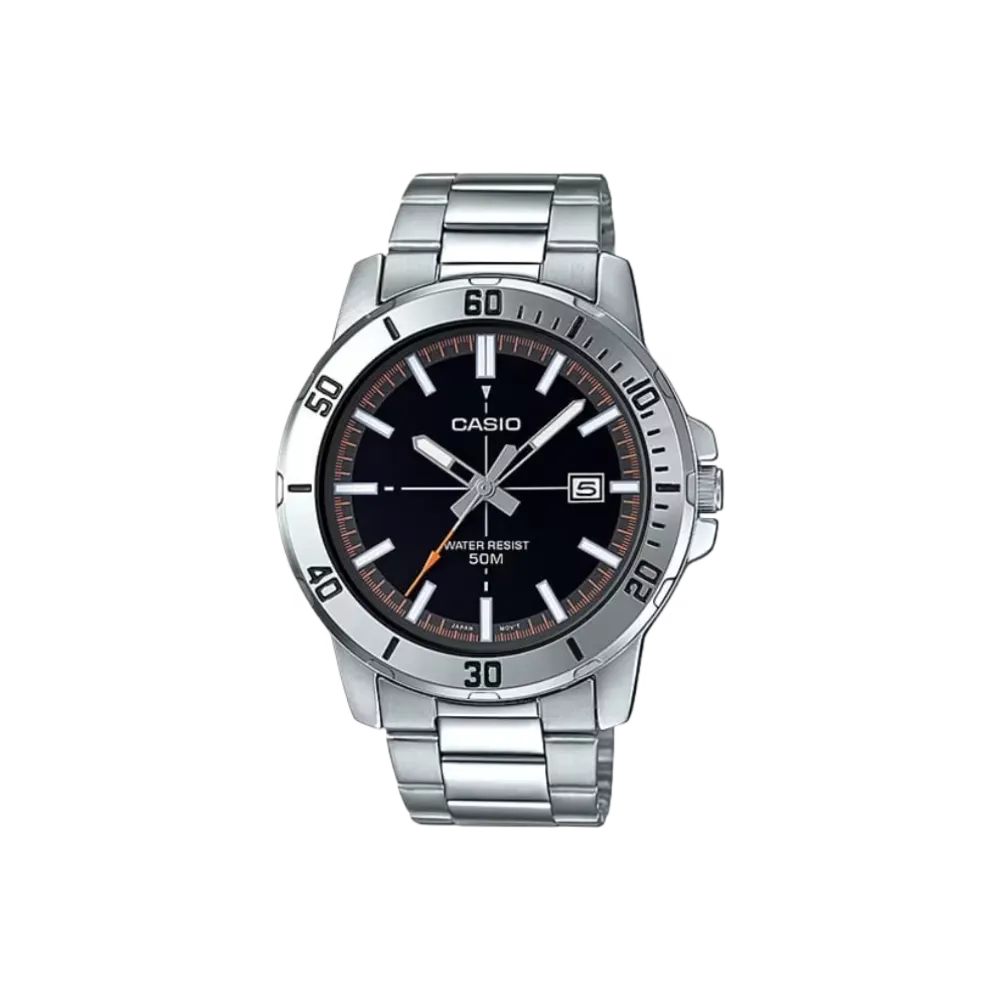The Casio MTP-VD01D-1E2V Enticer features a clean black dial with date display, stainless steel case and bracelet, and 50m water resistance. A versatile everyday analog watch.