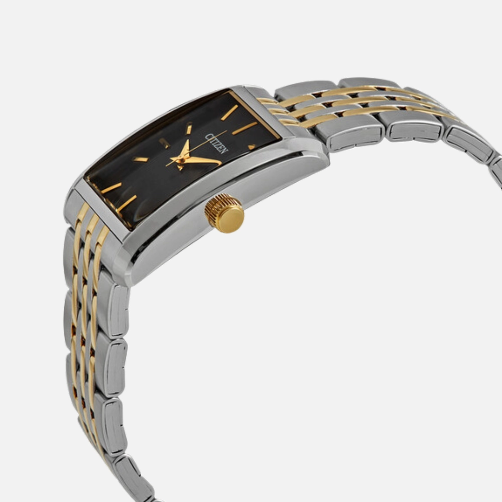 Citizen opts for a clean black dial punctuated by applied gold-tone stick markers and slim hands, all of which catch the light just enough to remain legible without being flashy. A discreet date window at 3 o’clock keeps functionality in the mix. The mineral crystal provides a clear, scratch-resistant window into the dial, helping the watch maintain its crisp appearance even after daily wear.