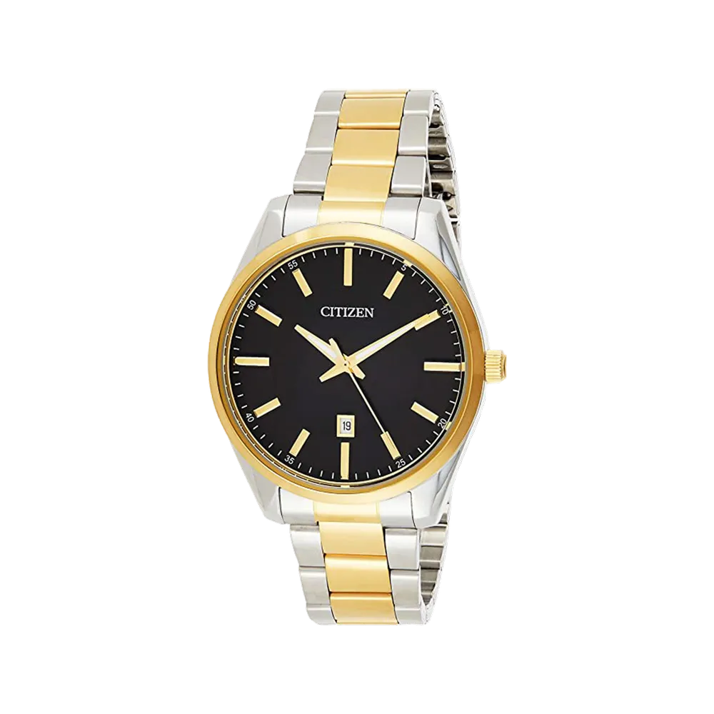 Citizen’s BI1034-52E pairs a clean black dial with gold-tone accents on a two-tone stainless steel bracelet. Powered by the reliable caliber 1112 quartz movement with 100m water resistance and date display. A dressy daily wearer that does not try too hard.
