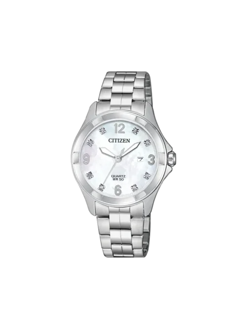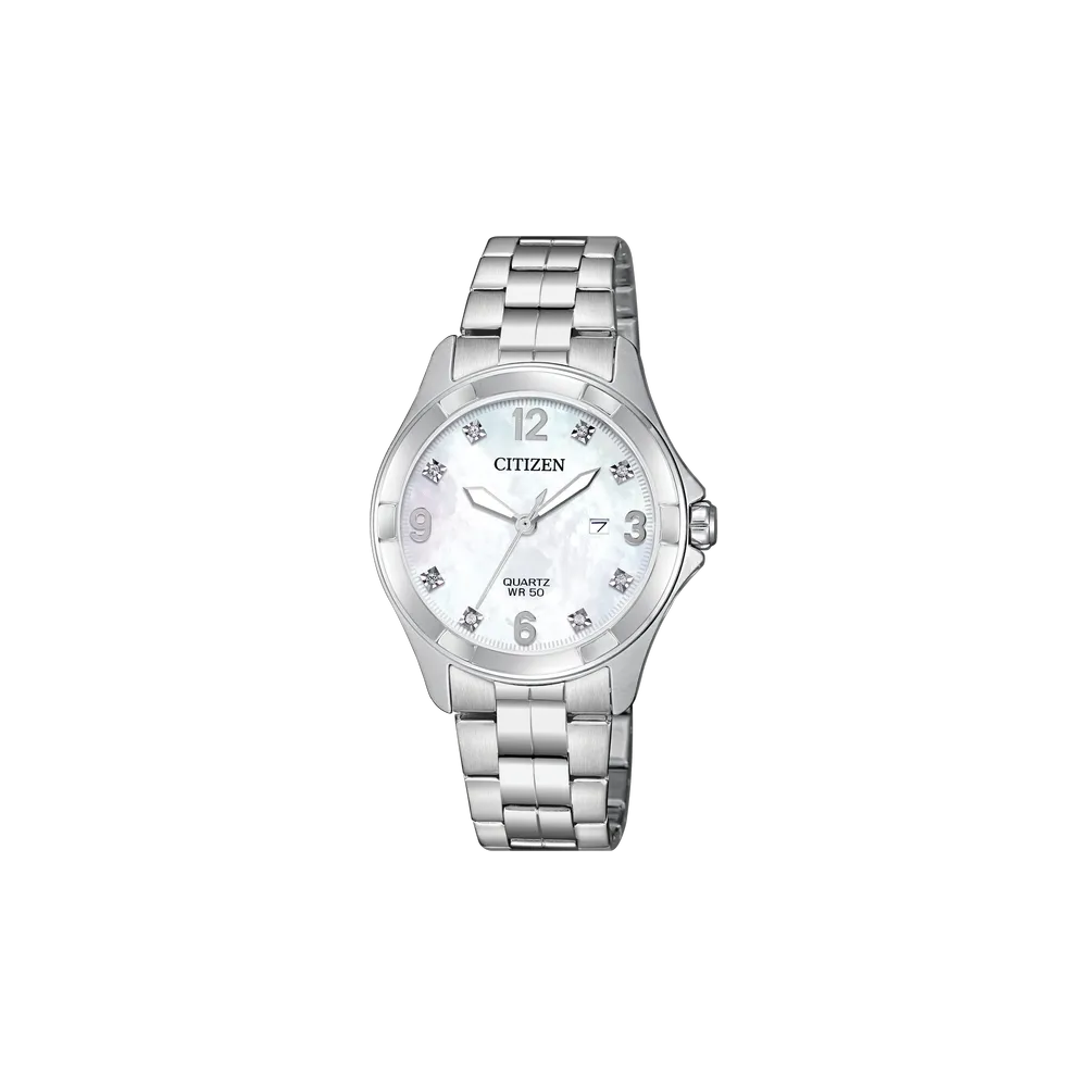 Citizen’s EU6080-58D puts a mother of pearl dial and crystal hour markers on a compact 32mm stainless steel bracelet. Quartz with a date window at 3 o’clock and 50m water resistance — the kind of watch that dresses up without trying too hard.