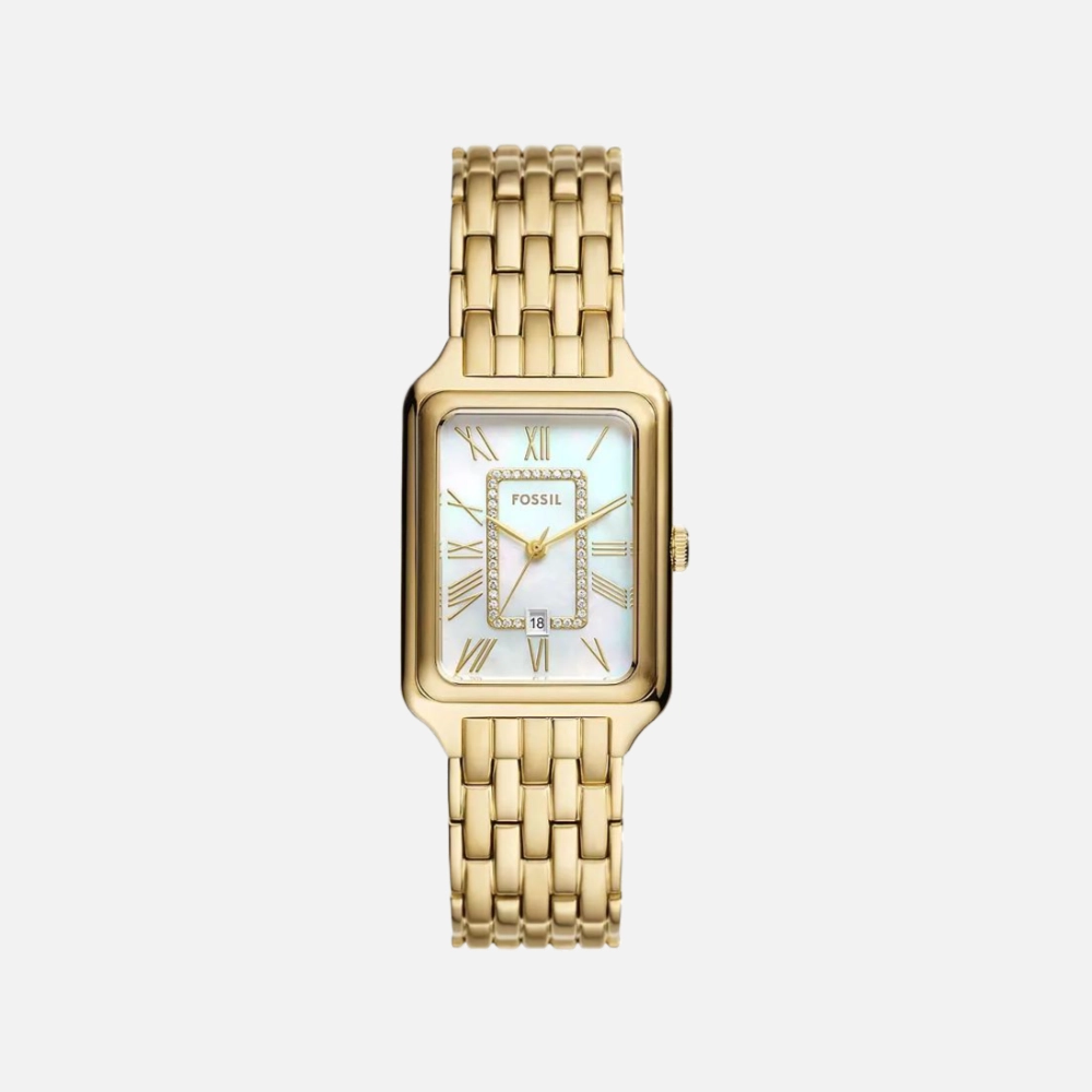 The Raquel is Fossil’s compact dress watch—26mm in diameter, mother-of-pearl dial, gold-tone everything. It’s designed to look like jewelry that tells time, and it succeeds at that.
