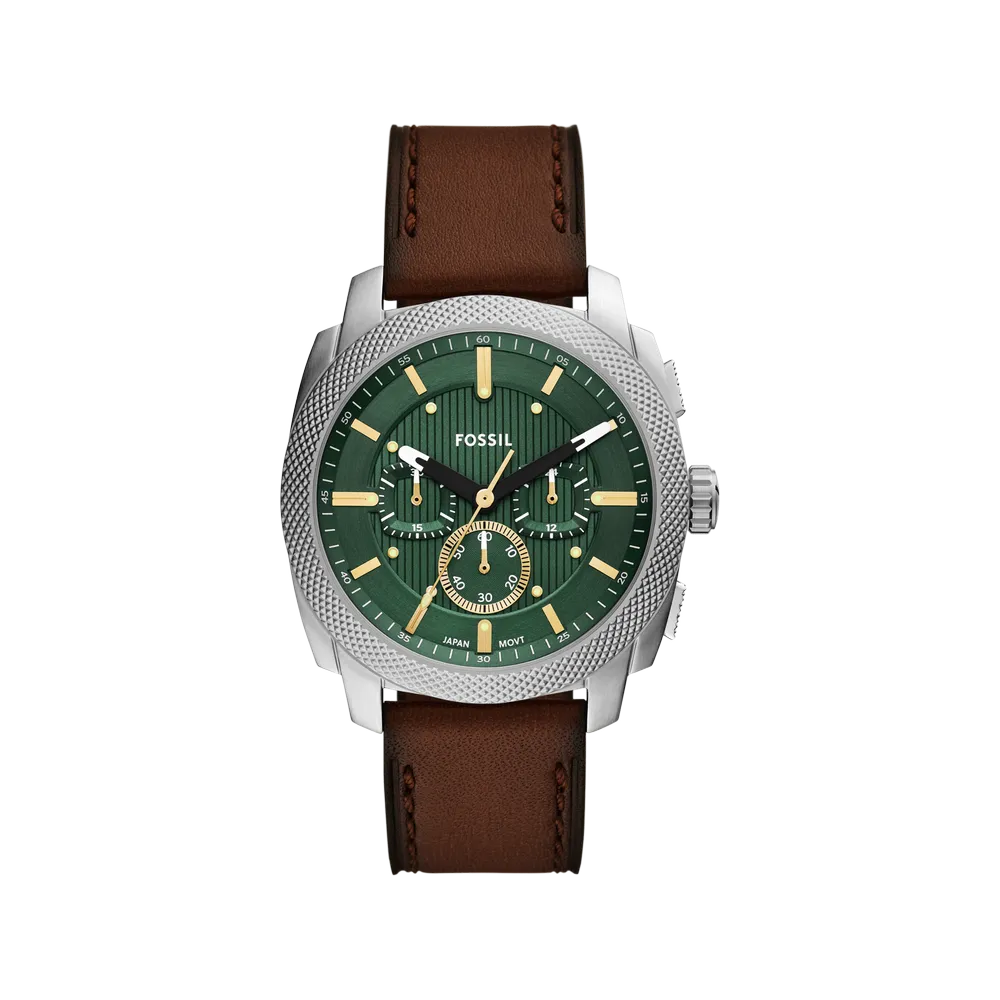 Fossil’s Machine chronograph with a textured green dial and signature knurled topring bezel. 44mm stainless steel case, quartz chronograph movement, brown leather strap. Industrial-inspired design with ribbed dial texture that catches light.