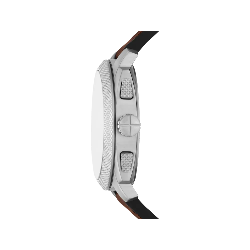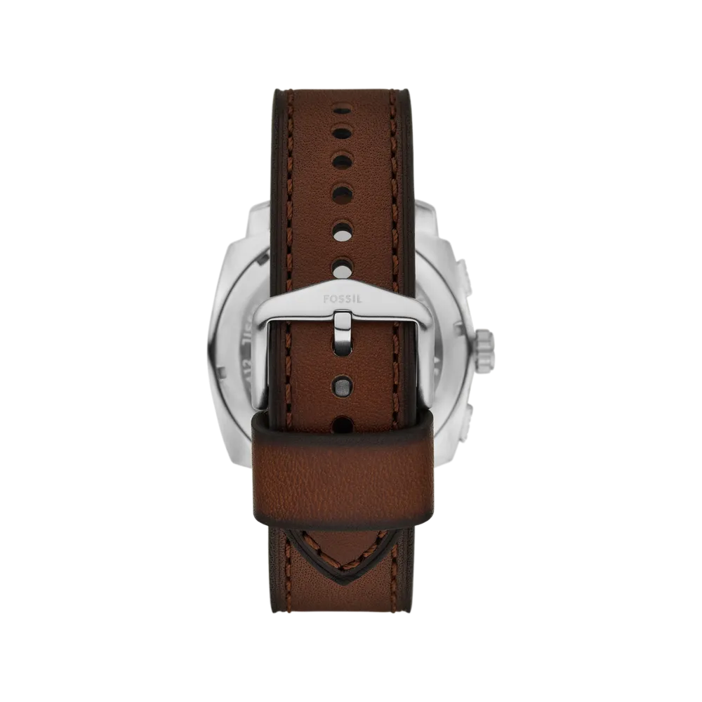 What distinguishes Machine from Fossil’s other chronographs is the knurled topring, a textured bezel edge inspired by industrial hardware. It adds both visual and tactile interest that generic chronograph cases lack. The 44mm stainless steel case with mineral crystal is built for daily wear, and 5 ATM water resistance handles routine exposure.