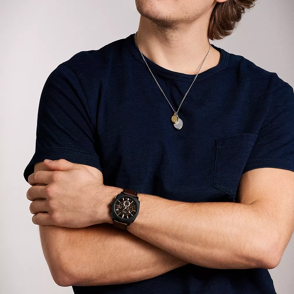 The Machine is one of Fossil’s more industrial designs—exposed screws on the bezel, textured dial, bold case. The FS6101 version plays up the contrast between black steel and warm brown leather.