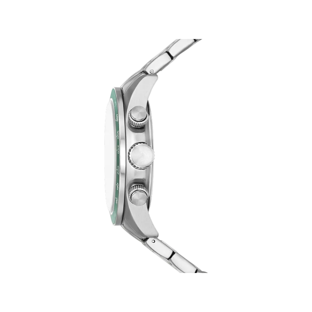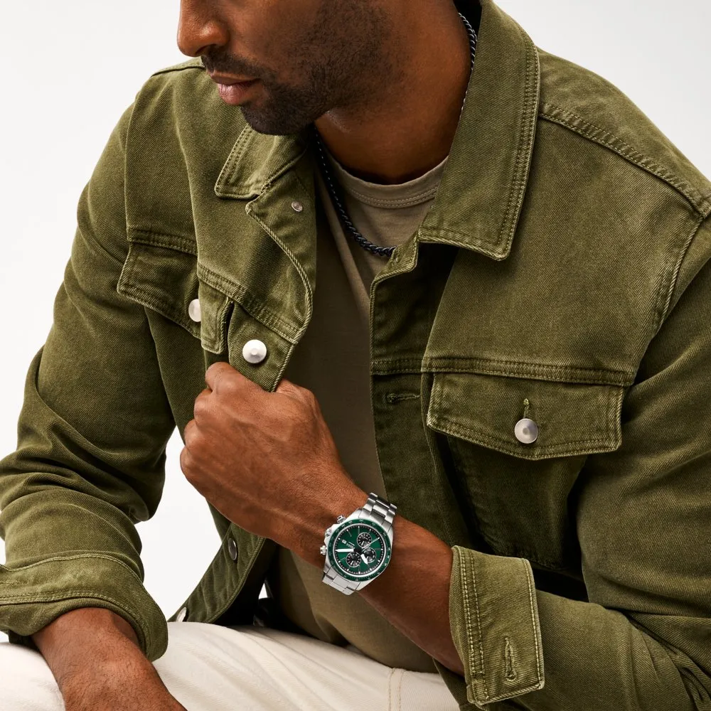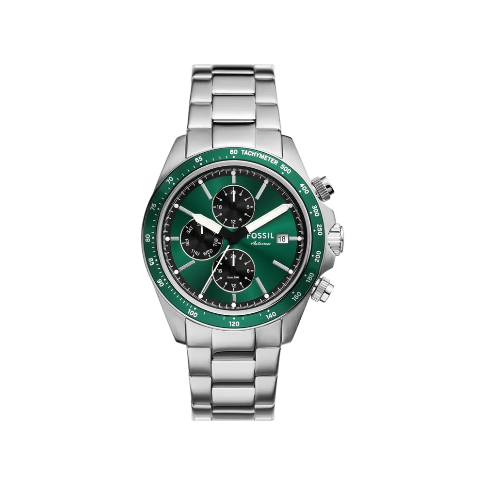 The Fossil FS6127 Autocross features a bold green sunray dial with racing-inspired multifunction layout. 42mm stainless steel case and bracelet, dual time zone, day display, and 50m water resistance.