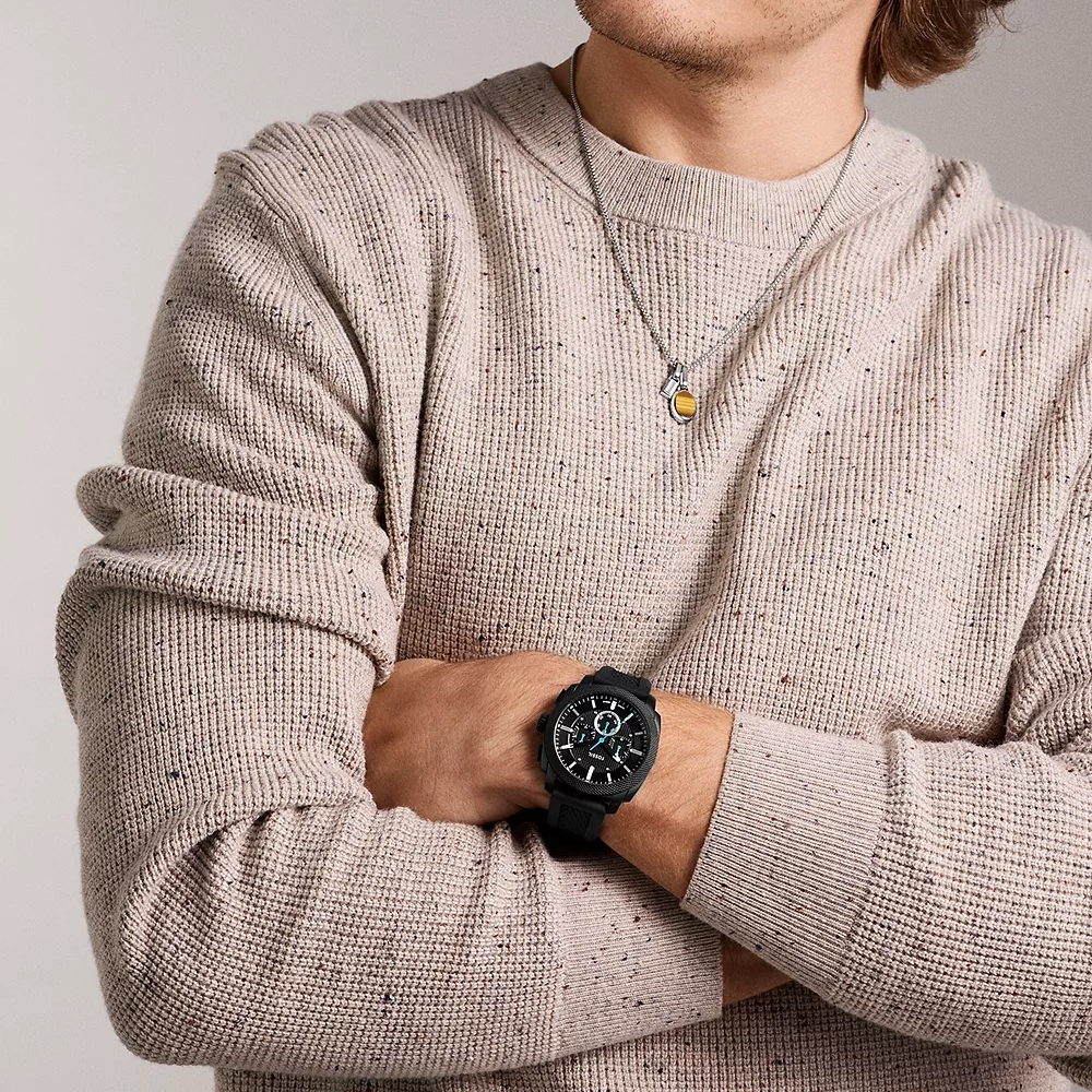 Fossil’s Machine series leans into the industrial aesthetic—bold case, textured dial, visible hardware. The FS6099 goes all-black with blue chronograph accents that pop. The silicone strap keeps it sporty and comfortable, and at 44mm it has presence without being ridiculous.