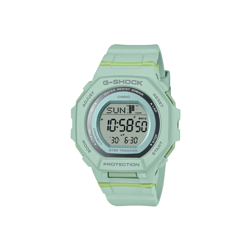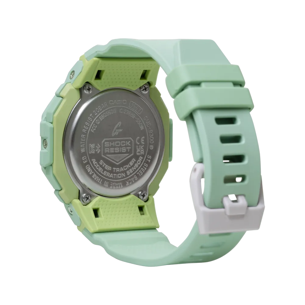 The Casio G-Shock GMDB300-3 from the G-SQUAD collection is designed for those who lead an active lifestyle. Built with a compact bio-based resin case and band in a fresh pale green colorway, this fitness-oriented timepiece combines G-Shock’s legendary toughness with modern smart features that support your daily wellness goals.
