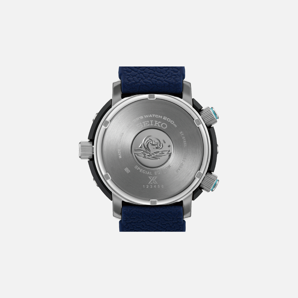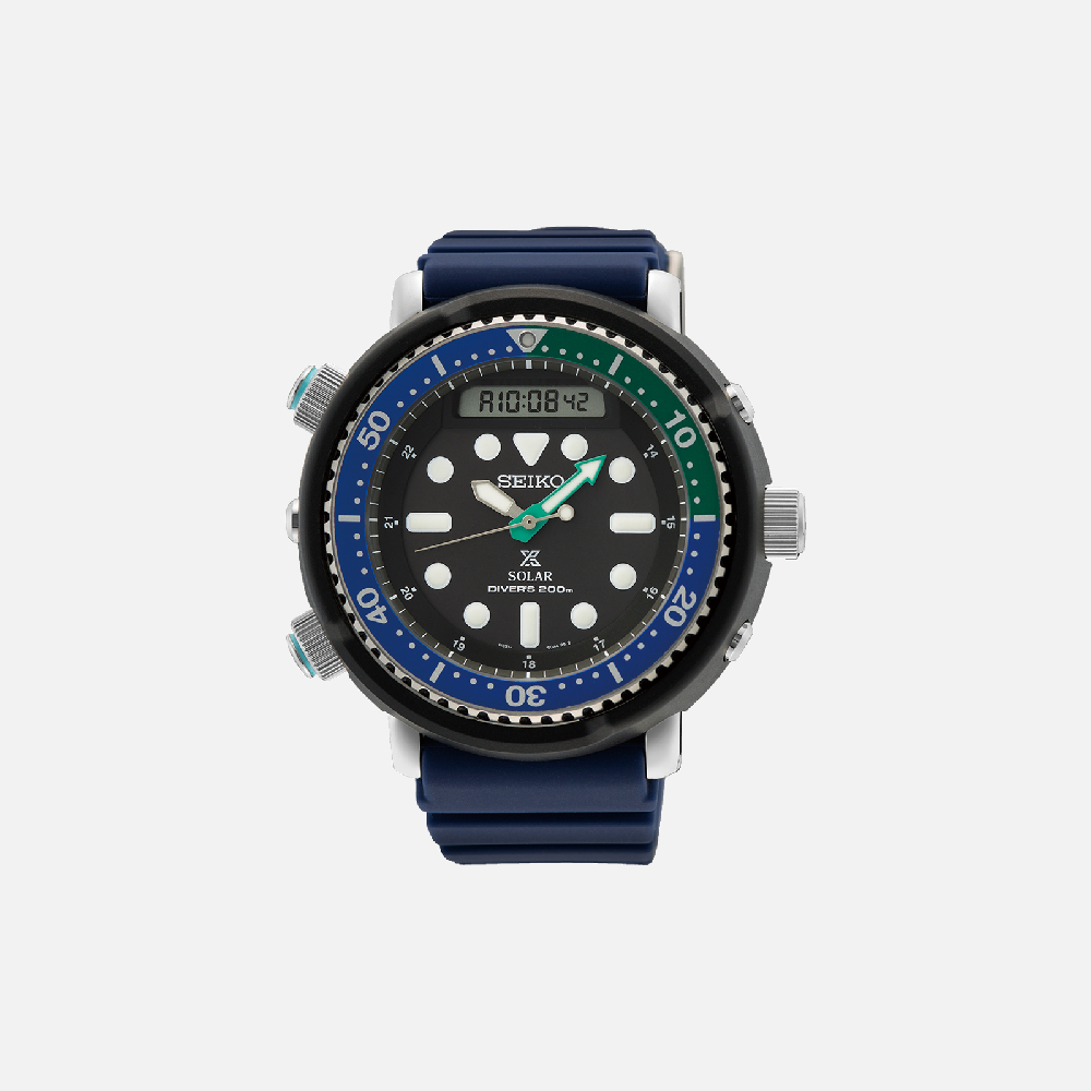 The Prospex SNJ039’s dial is adorned with LumiBrite-coated hands and markers, ensuring that the time remains visible in even the darkest of environments. The captivating blue gradient dial is reminiscent of the tranquil depths of a tropical lagoon, a subtle nod to the watch’s namesake. With a day/date display and digital alarm/chronograph functions, the Tropical Lagoon is a symphony of practicality and style.