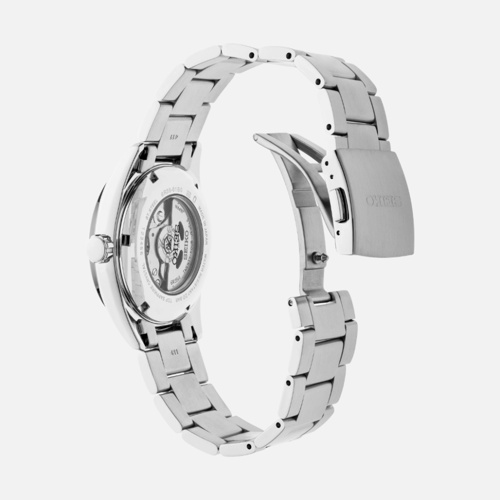 Constructed in stainless steel, the watch features a screw-down crown and a see-through case back. The case thickness is 12.9 mm, with a lug-to-lug length of 46 mm, giving wearers a presence without excess bulk. The bracelet is also stainless steel, fitted to 20 mm lugs, and secured via a tri-fold push-button release clasp for both comfort and security.