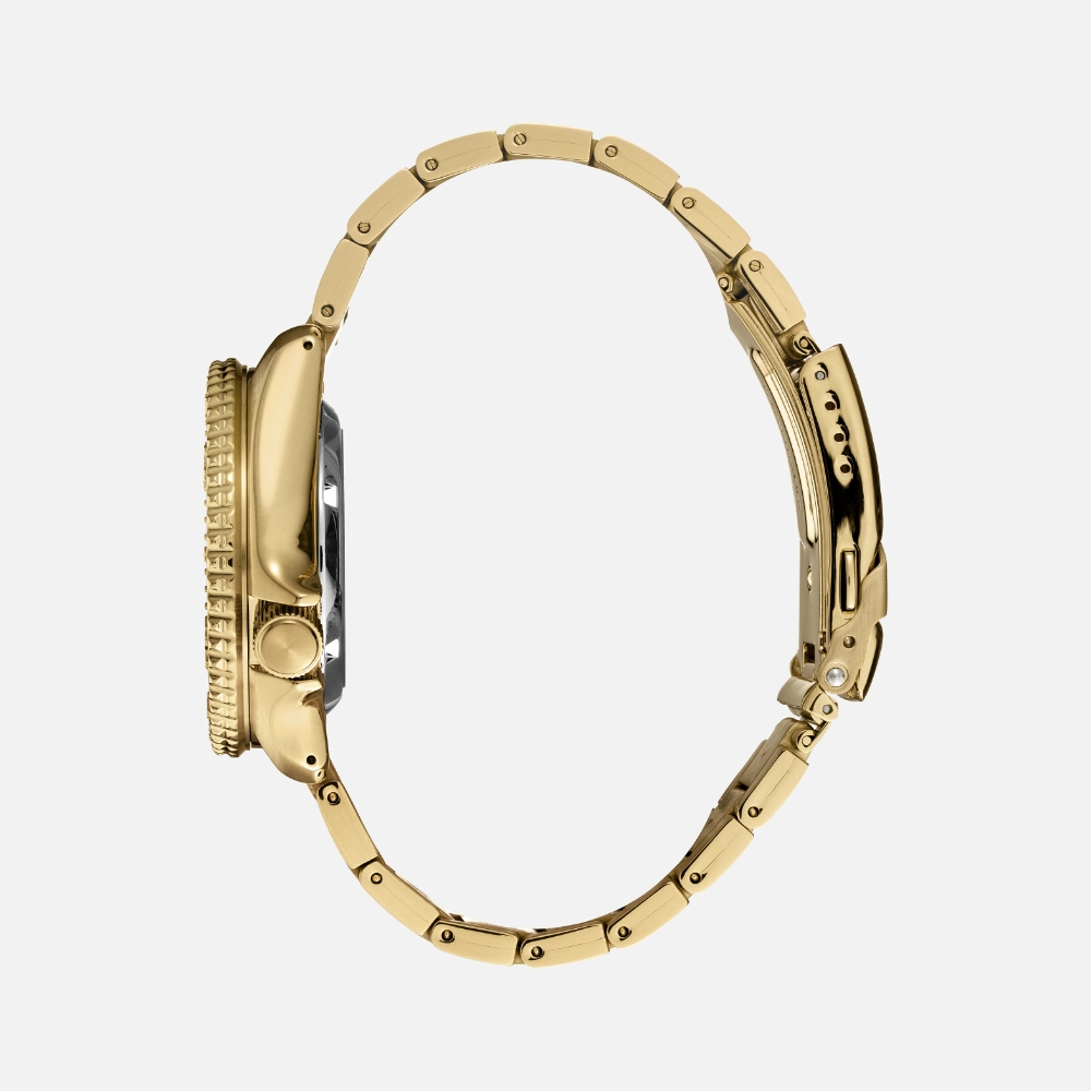 The full gold-tone SKX isn’t trying to be subtle. 42.5mm case with matching dial, bezel, and bracelet—Seiko’s 4R36 automatic with day-date, exhibition caseback, and 100m water resistance. For those who want the SKX silhouette in a finish that announces itself.