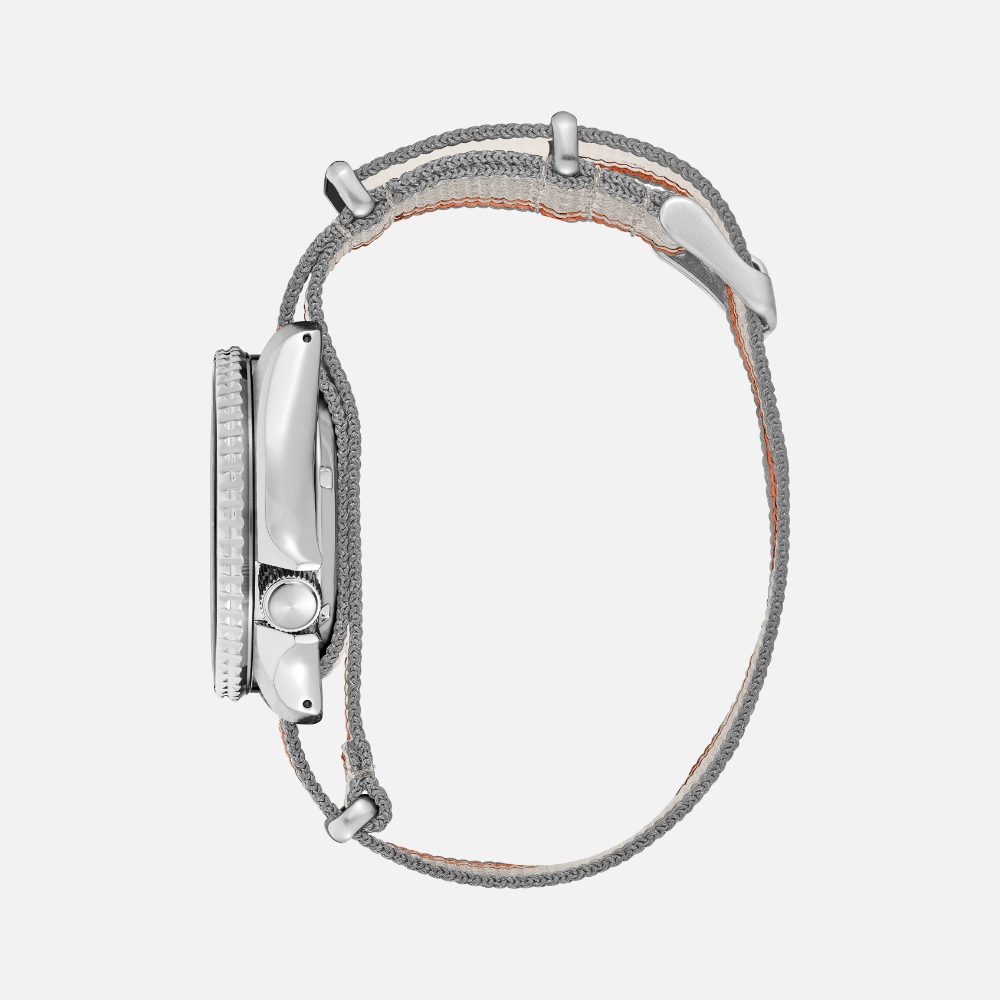 Case Dimensions: 42.5 mm diameter, 13.4 mm thickness, 46 mm length Movement: Automatic Caliber 4R36, 21,600 vibrations per hour, 24 jewels Crystal Material: Hardlex crystal Water Resistance: 10 bar, 100 meters (330 feet) Dial Color: Orange Strap: Light gray and orange striped nylon, 22 mm lug width Weight: 102 grams