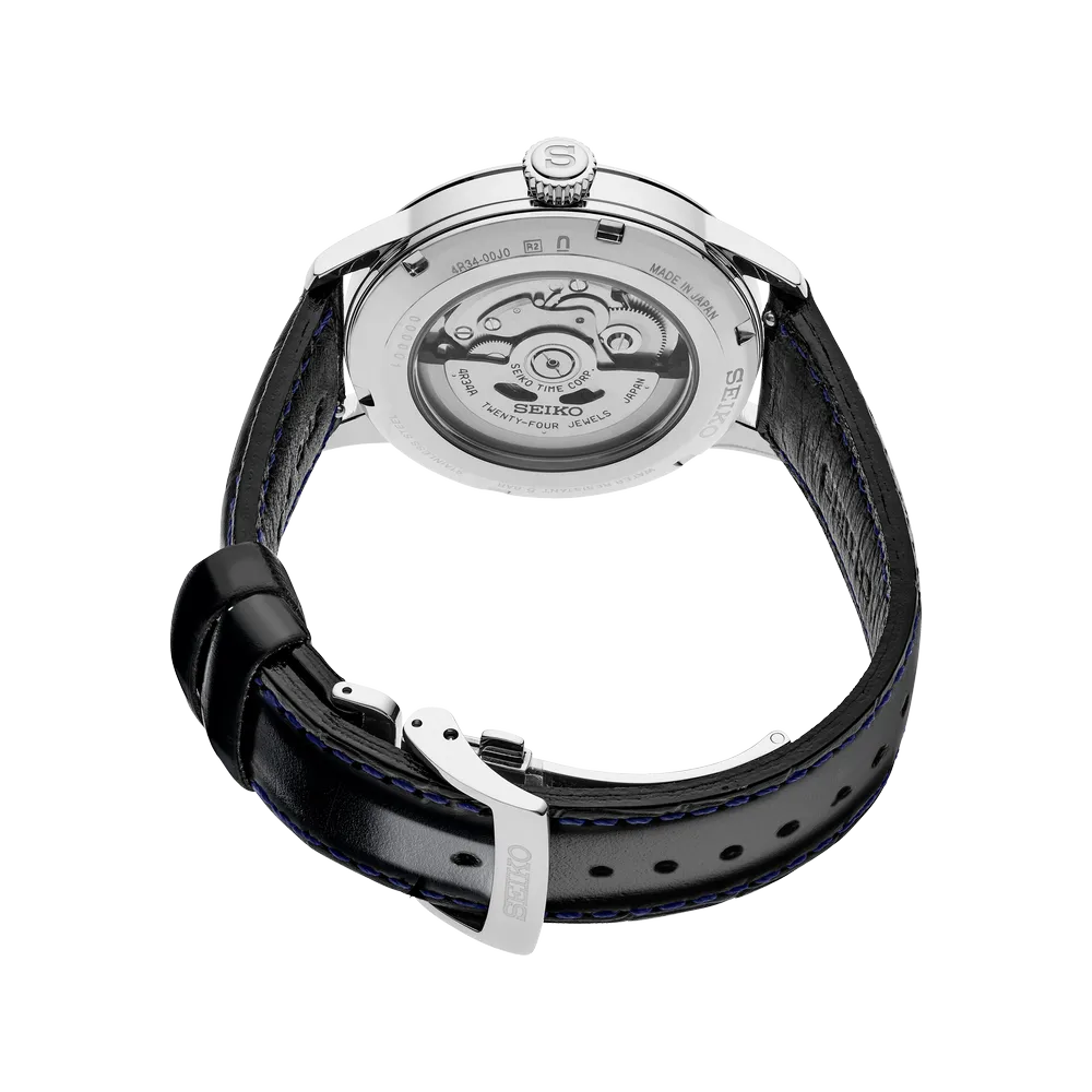 The Seiko SSK049 is the Cocktail Time that learned a second language. Adding a GMT complication to the Presage line’s best-known sub-collection sounds like it could go wrong — dress watch meets travel function — but Seiko pulled it off. The deep pressed silver dial keeps the Cocktail Time DNA intact while the blue cursive Arabic numerals on the 24-hour track add a layer of visual interest that most GMT watches at this price simply don’t attempt.
