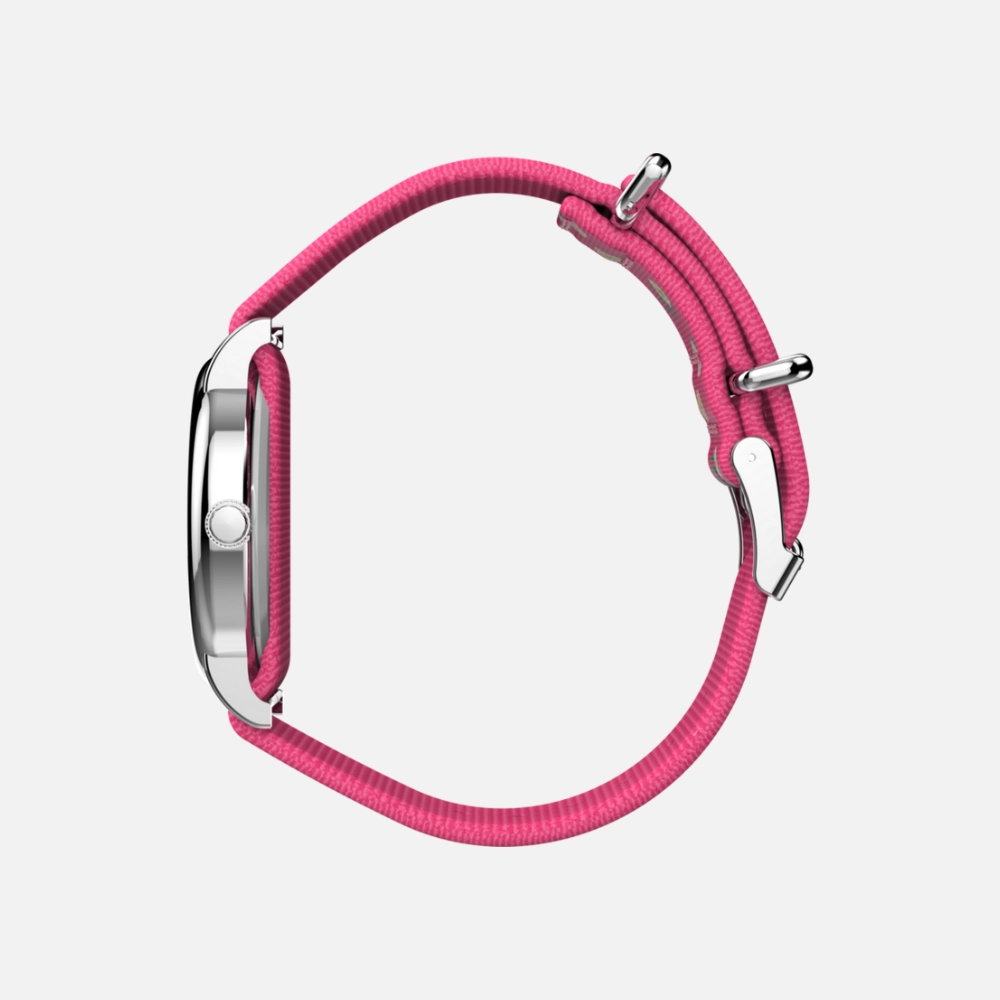 The Weekender x Peanuts collection puts Snoopy on your wrist in a format that actually works. The 38mm brass case with floral dial art and pink fabric strap is playful without being childish—plus you get Timex’s INDIGLO backlight.