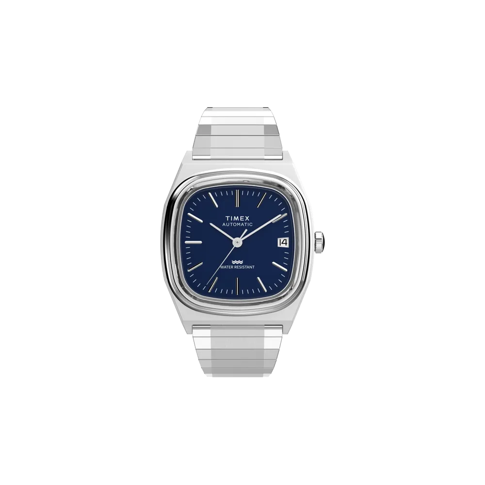 Timex brought back their 1983 E-Line with the automatic movement it deserves. The 34mm square case—nicknamed the “TV Dial”—is vintage-correct sizing before watches got oversized. Blue dial on a steel expansion bracelet feels genuinely retro, not costume retro.